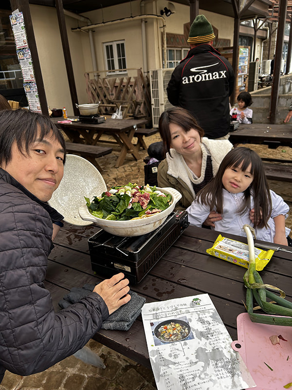 雨天で肌寒い気候でしたが、江戸崎かぼちゃをはじめ、ネギ・さつまいも・大根・白菜・人参など、稲敷市産の新鮮な野菜が並ぶ様子を見て、参加者一同笑顔に。素材の味を活かした、優しい味わいのほうとう鍋となりました。